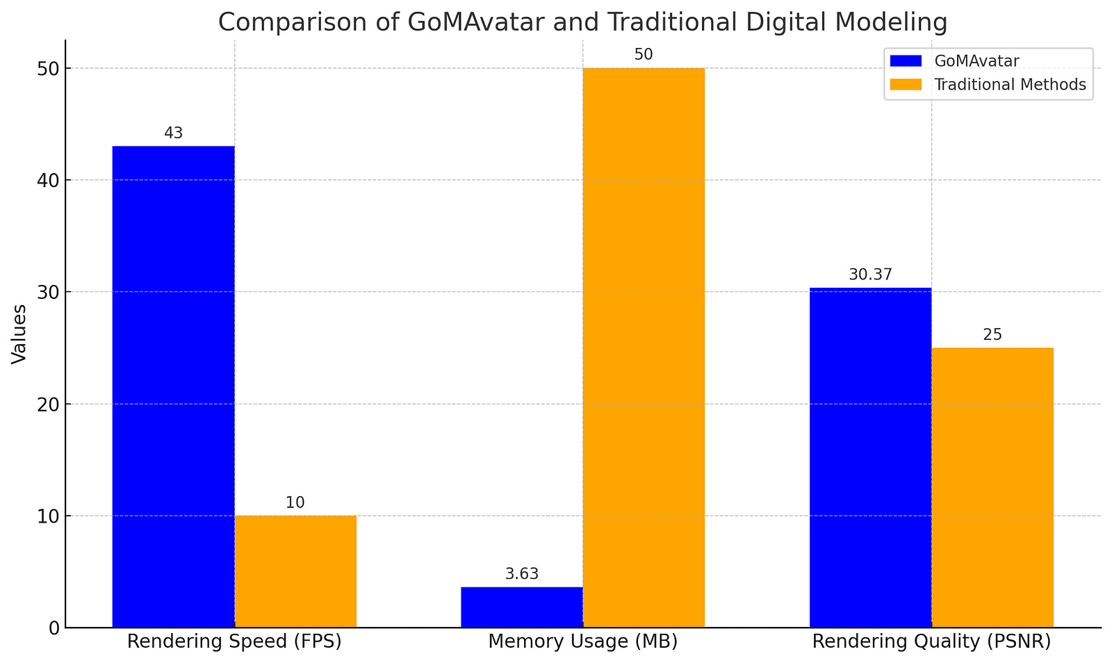 GoMAvatar stands out with its minimal memory footprint, only 3.63 MB per subject. This efficiency means it can operate on standard consumer-grade hardware, making advanced digital modeling technology more accessible than ever before.